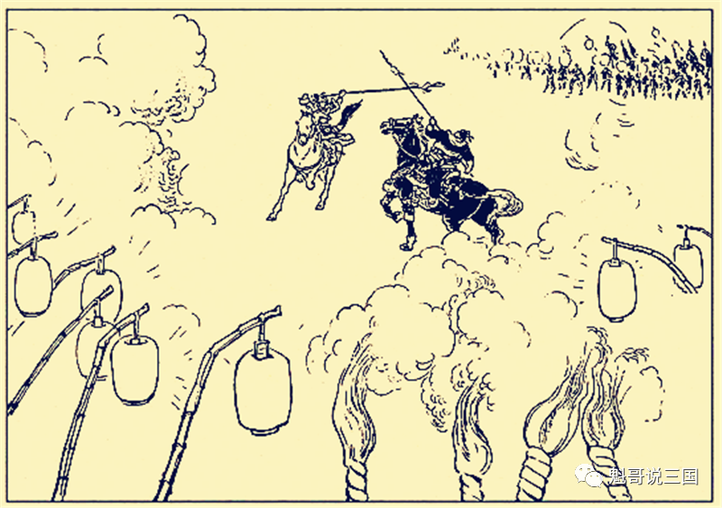 两军呐喊,点起千百火把,照耀如同白日。两将又向阵前鏖战。到二十余合,马超拨回马便走。张飞大叫曰:“走那里去!”原来马超见赢不得张飞,心生一计:诈败佯输,赚张飞赶来,暗掣铜锤在手,扭回身觑着张飞便打将来。