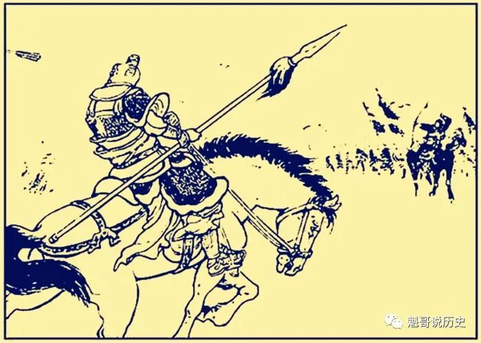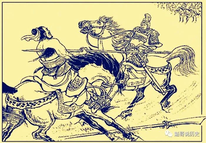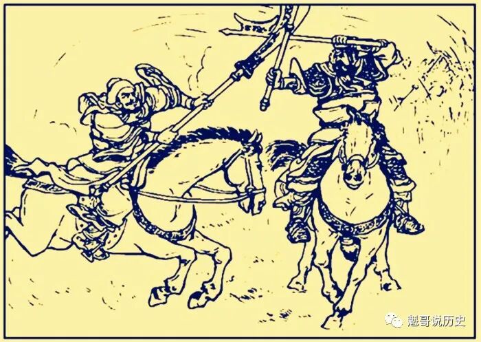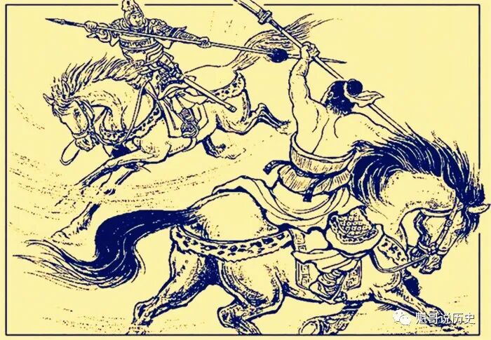 原文:超闪过,一枪望褚心窝刺来。褚弃刀将枪挟住。两个在马上夺枪。许诸力大,一声响,拗断枪杆,各拿半节在马上乱打。操恐褚有失,遂令夏侯渊、曹洪两将齐出夹攻。