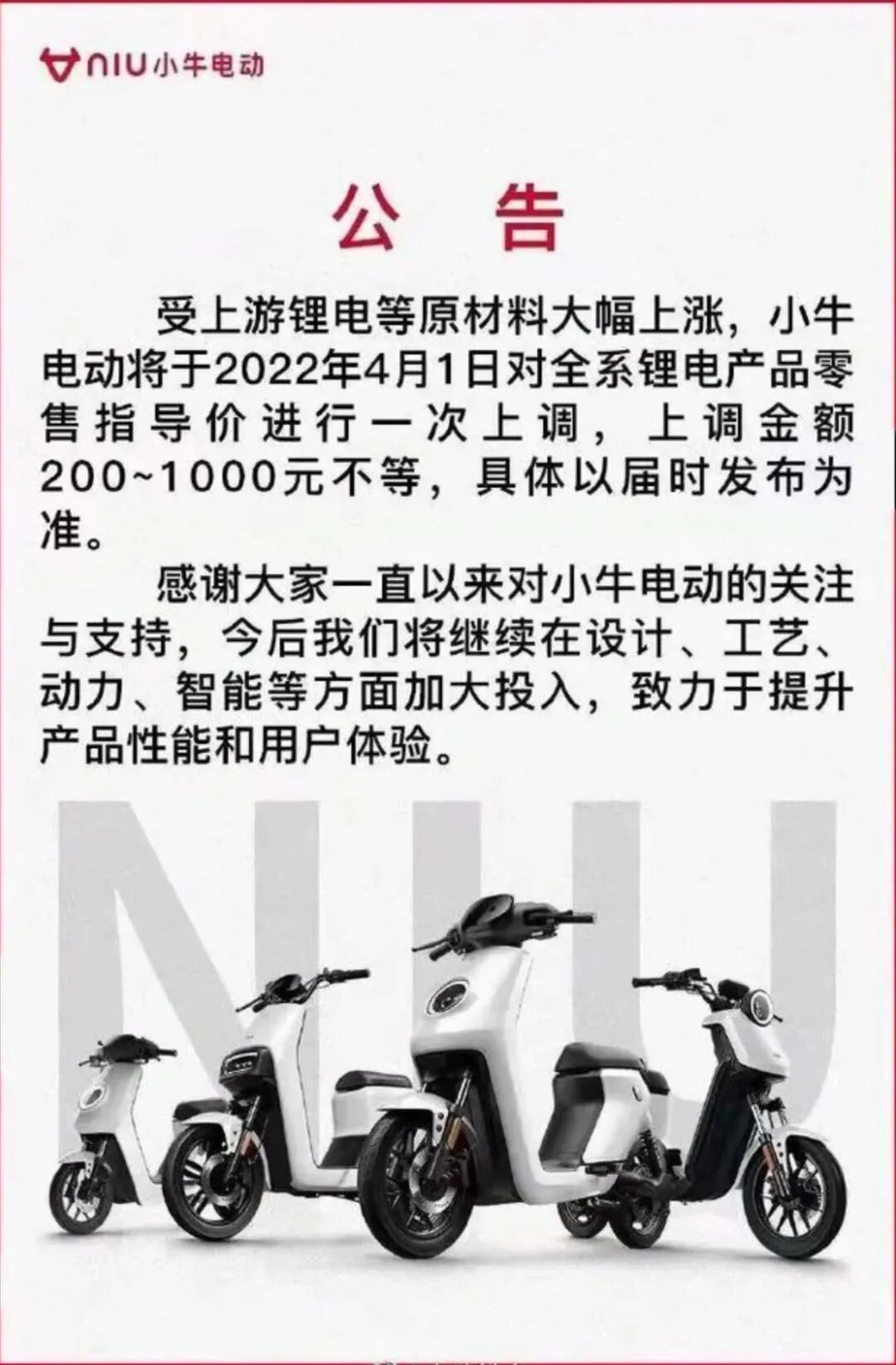 不过事情没那么简单,因为新能源汽车也跟着今年油价来一波疯涨。甚至就连两轮电动车小牛也宣告涨价200~1000元不等。