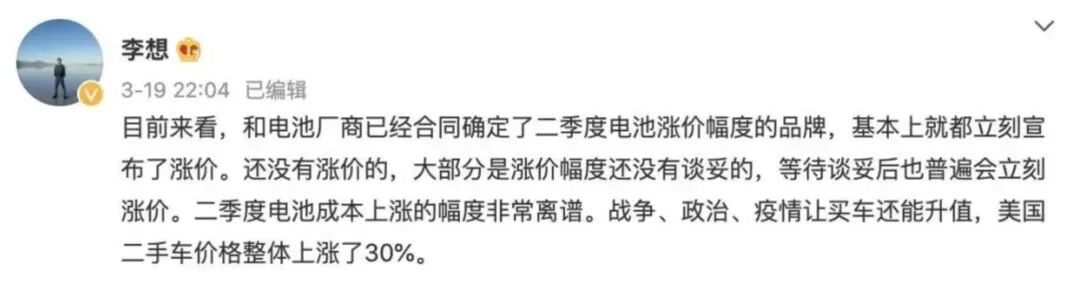 面对涨价狂潮,理想汽车CEO 李想在微博上表示,凡是和电池厂商谈妥了的,立刻都宣布涨价了,目前还没涨价的,大部分是涨价幅度还没谈妥的,等谈妥后也普遍会立刻涨价。言下之意很简单,只要是新能源汽车,那就必须要涨价。