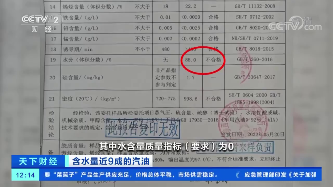 根据央视报道,其中一位车主在加完油之后开出3公里后车辆就发生了剧烈抖动,随即熄火。车主立刻打车返回加油站,发现已经有不少车主都遇上了同样的问题。之后根据检验部门的报告显示,不仅汽油中的水含量严重超标,就连甲醇含量、硫含量等八项指标均不合格,不符合国家92号汽油标准,属于不合格油品,随即加油站相关人员已经被警方控制,并立案调查。