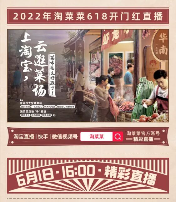 6月1日16:00,淘菜菜菜市场出摊啦。以线上直播的形式,邀你一起云逛不一样的神仙菜市场,看东西南北中各地菜市场特色,听久违的此起彼伏的吆喝声,闻各地蔬菜瓜果芳香,豪礼拿到手软.......