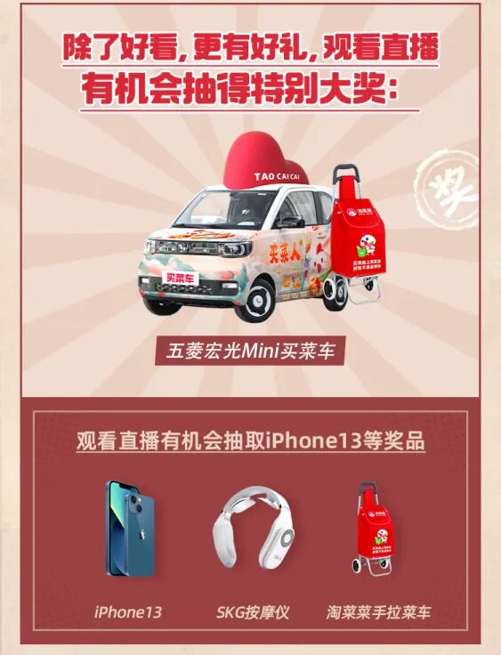 在这里,除了能云逛菜市场,吸一吸人间烟火气,还能豪礼拿到手软——1辆五菱荣光MINI,10台iphone13手机,132台手淘菜菜定制推车,12个SKG按摩仪......豪礼送不停。