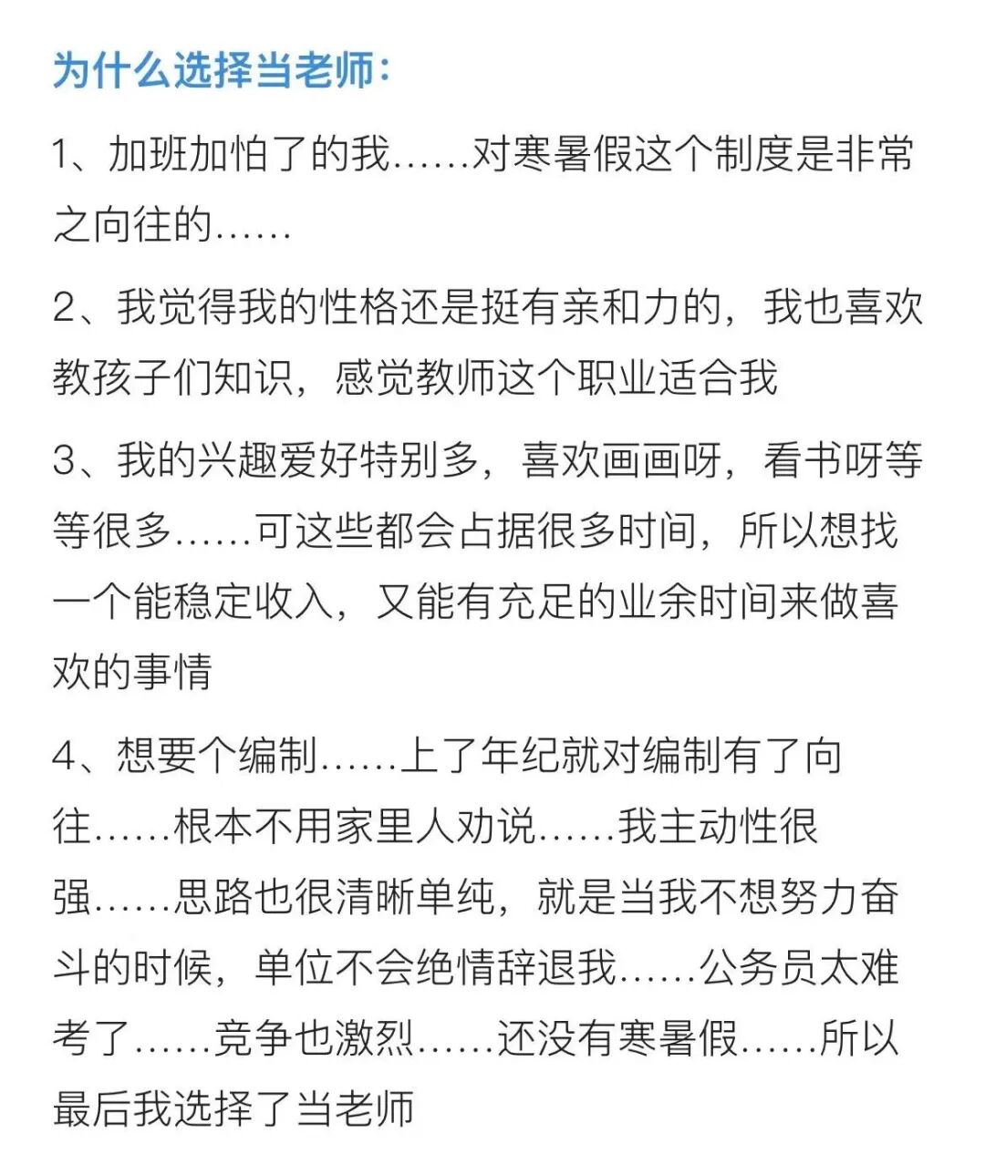3、寒暑假,拥有寒暑假的工作真的真的太香啦~程序员的时候只能盼望着法定节假日,然后节假日还可能会被剥削加班,这样的假期就很鸡肋,异地的无论是回家还是去旅游,时间都根本不够用~来也匆匆去也匆匆…。但有了寒暑假,就可以拥有说走就走的旅行,想玩几天就几天,不再因为要上班有“倒计时”的感觉。而且长大了以后真的会怕“子欲养而亲不待”的情况,所以自从拥有了寒暑假,我都会折腾回家多陪陪父母。随着年纪的增长,多陪陪父母的想法就越来越深刻。