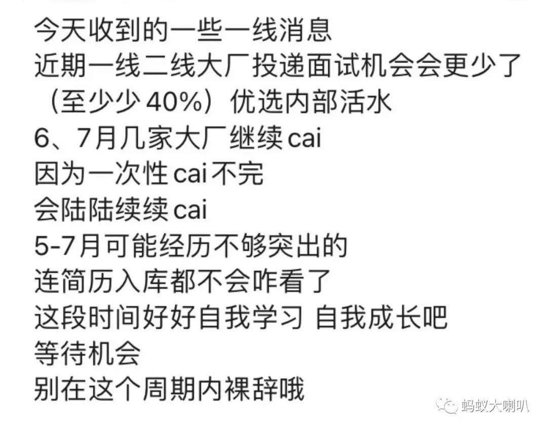 联系的猎头爆料(不知道真假,自己辨别),称近期一线二线大厂,面试机会更少了,起码少40%,优先内部活水,几家大厂在六月七月会继续裁员。