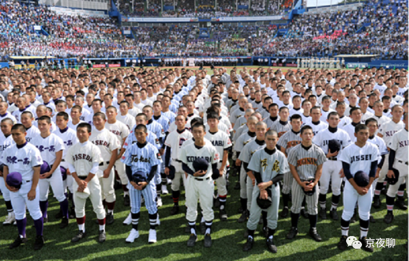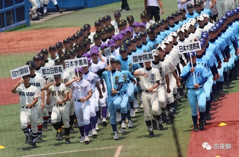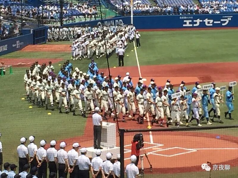 ▲踩着进行曲《栄冠は君に輝く》,各个学校球队步入会场