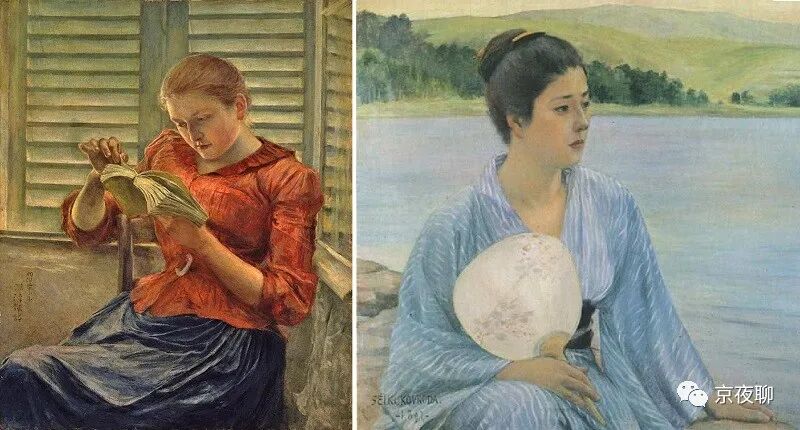 黑田清辉有两幅画,《湖畔》和《读书》,曾经挂在白洲正子家饭厅(请回看《白洲次郎和白洲正子》),陪伴这个孤独的贵族少女孤独的童年。那么丁点大的小丫头,一口咬定这两个画中人很相像,但明明一个白种人、一个黄种人,五官、穿着没有一处相像。多少年后大人们也承认小丫头没有说错,这两个人有一个地方相通,她俩一前一后都曾独据画家黑田清辉的心房。