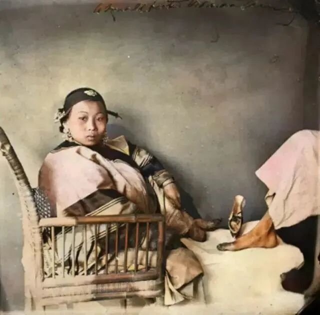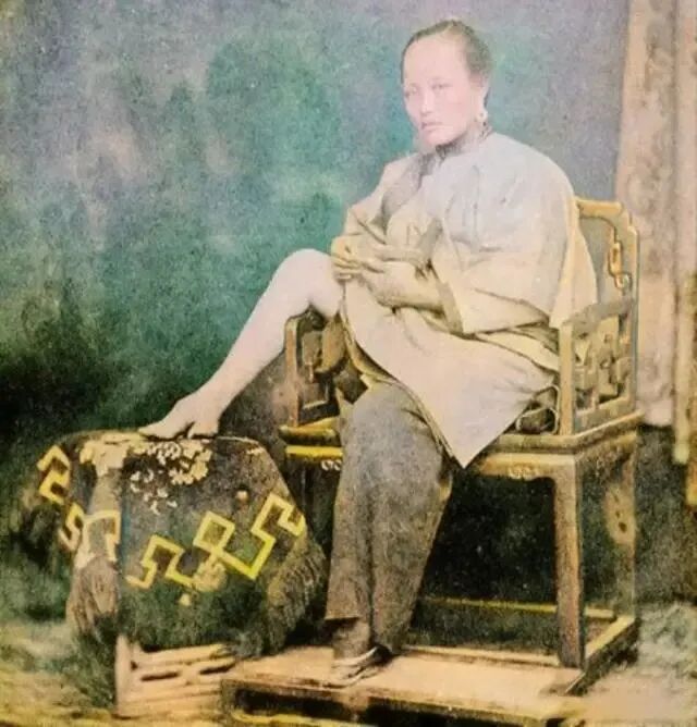图5:1905年,广州。老西关的伶人,她撩起裙子露出半条大腿和裹脚,这只是为了满足洋人们的猎奇心态。