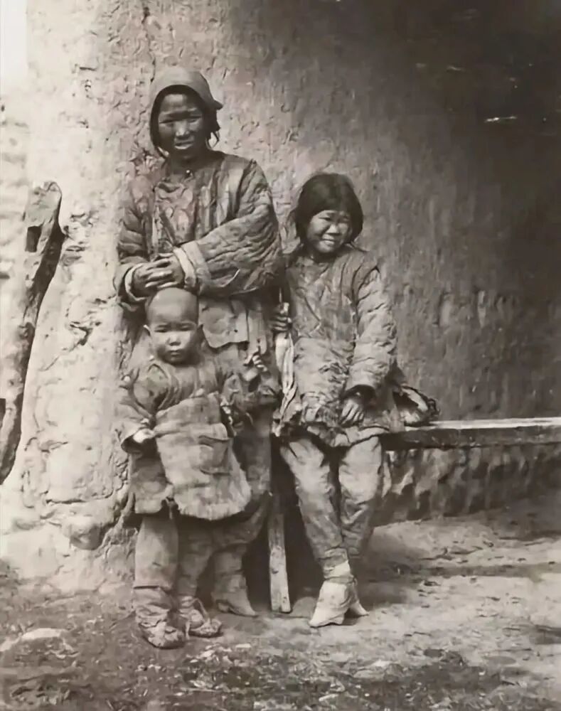 一位母亲和她的两个孩子,衣衫褴褛,不忍直视。大一点的女孩已经缠足,这不是千金小姐,在生计面前。早早失去了劳动能力,注定一生悲惨。