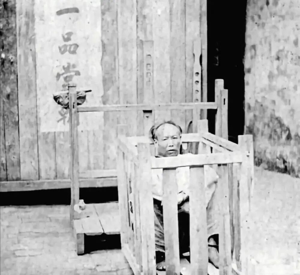 关在木笼中的犯人,这笼子看起来不到一米高,犯人畏缩在里面,手脚都没法活动,相比肉体的折磨,精神上的折磨更令人崩溃。清朝刑罚五花八门,只有想不到,没有做不到。