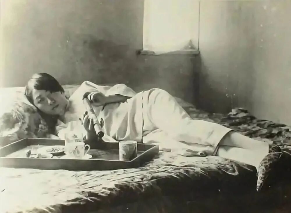 抽鸦片的女子,躺在床榻上,拿着烟枪,媚态十足。清末,为了给洋人赔款,鸦片种植泛滥,导致上百万人吸食。图中女子被鸦片折磨,目光呆滞,整日与床为伴。