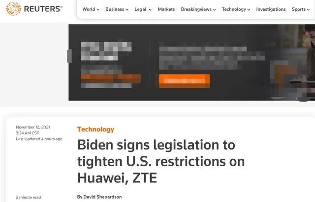 路透社称" 安全设备法 " 的通过是美国政府打压中国电信和科技公司的最新举措。据悉该法案上月在众议院以420比4的投票结果通过,随后参议院也在10月28日以口头表决形式将其通过,随即它被送交拜登签署,拜登的签署也意着该法案正式生效,美国对华为、中兴等中国科技公司的打击进一步升级。