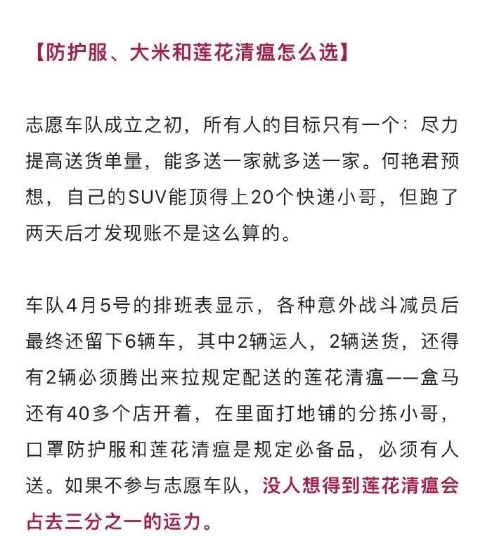 真正让整件事情进一步发酵的是自媒体《为你写一个故事》的博主雷斯林。他刚好被封在上海,也刚好写了一篇反映“上海运输难在哪”的文章《我在盒马当司机……》。内容中有关于“很多缺菜的上海人收到了连花清瘟的情况……于是“连花清瘟占用运力”这个点一下子让利害关系方扩大到整个上海缺少必需品的人……这个面可就大了。