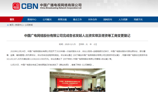 2020年12月25日,一直在实缴资金上悬而未决的中国广电股份,官宣表示已完成各省发起人出资实缴及增资等工商变更登记!