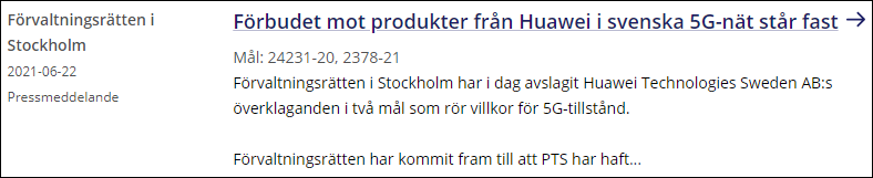 对于这项不公决定,华为公司提起了上诉。而在今年6月22日,斯德哥尔摩行政法院对此案作出判决,驳回华为上诉,判定瑞典政府的决定并不违法,即维持了这项“华为5G禁令”。