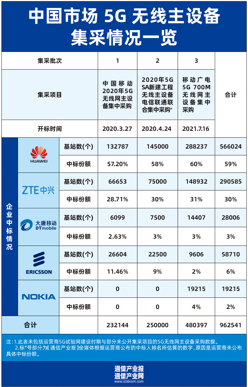 截至目前,四家运营商完成了三次规模较大的5G无线主设备集采,总投资额超过了1000亿元(不含税),集采基站总数约96万个,华为、中兴通讯、中国信科(大唐移动)、爱立信和诺基亚等中外五大主导设备商集体参与。