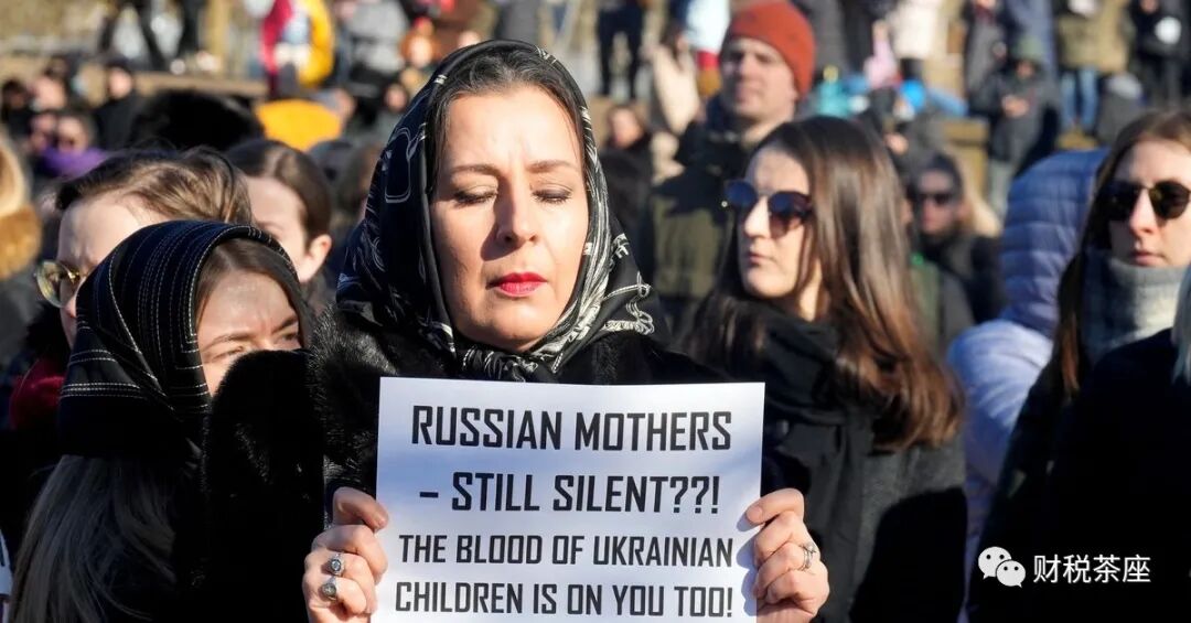 立陶宛妇女举起牌子,上面写着:“俄罗斯母亲,还在保持沉默嘛?乌克兰的孩子的鲜血在你们手上”