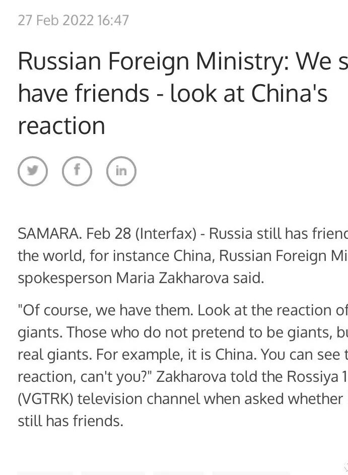 据国际文传电讯社,俄外交部发言人扎哈罗娃今天在采访中被问及俄罗斯在世界上是否还有朋友,她回答:当然还有朋友,例如中国。又称中国“不是假装巨头而是真正的巨头”。