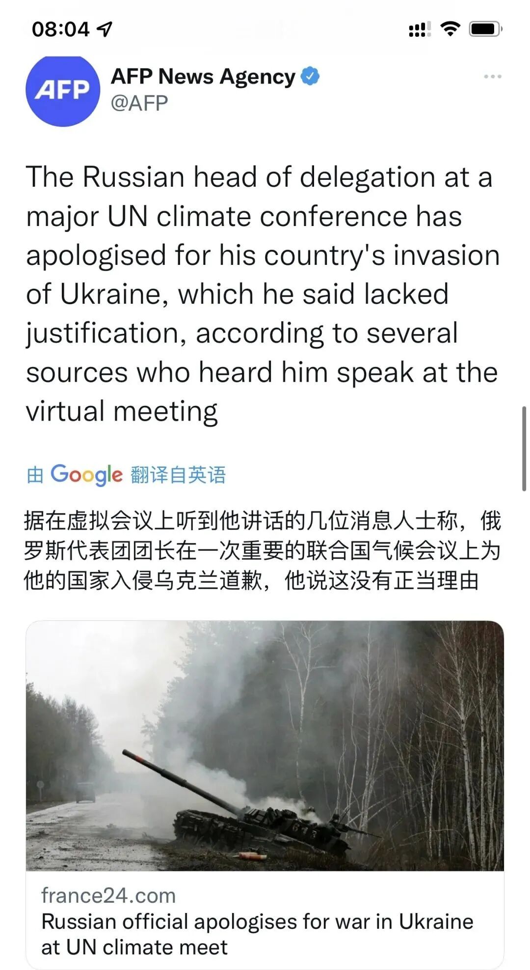 法新社消息,出席联合国气候网上虚拟会议的俄罗斯代表团团长向乌克兰代表就俄罗斯入侵乌克兰一事道歉,她是在乌克兰代表满腔激情诉说目前乌克兰遇到的险境后说:让我代表所有未能阻止这起冲突的俄罗斯人致歉。最后用俄语说:找不到攻击乌克兰的任何正当理由。这让出席会议的代表感到惊讶。