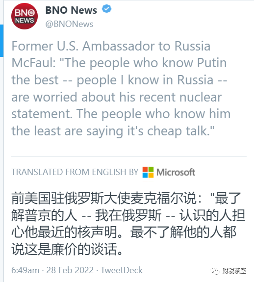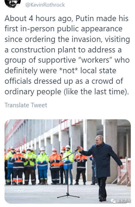 大约4个小时前,普京在下令入侵之后首次公开露面,参观了一家建筑工厂,向一群支持他的“工人”发表讲话,这些工人肯定不是地方政府官员,他们打扮成一群普通人(就像上次那样)。