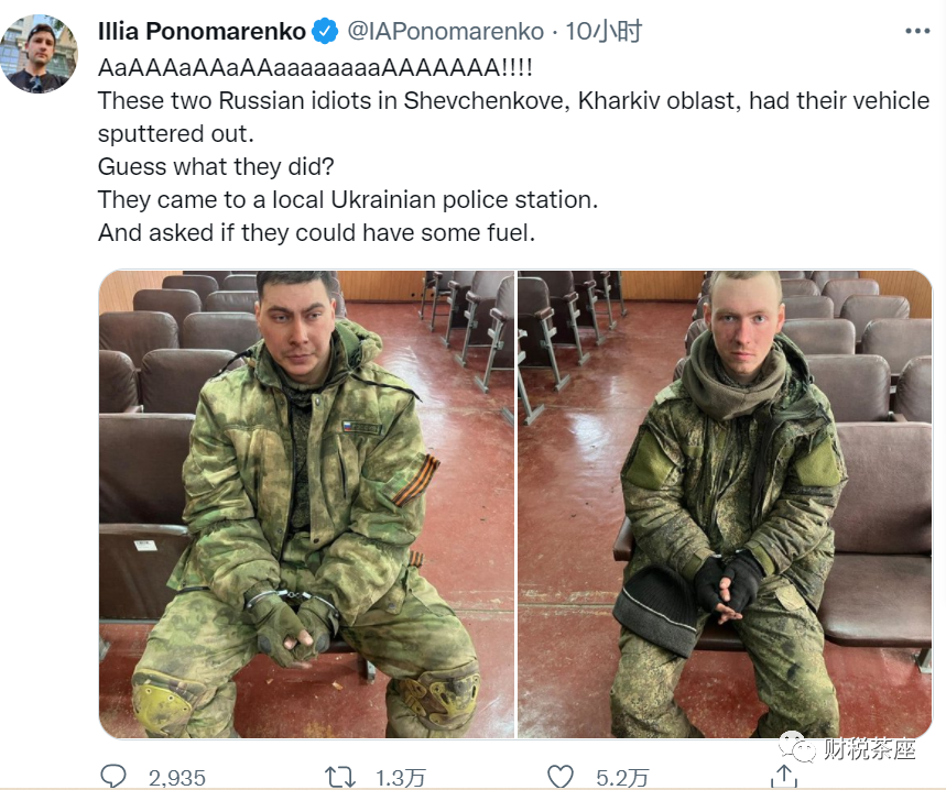 啊啊啊啊啊啊啊啊啊啊啊啊!!!这两个在哈尔科夫州舍甫琴科夫的俄罗斯士兵,他们的车没油了,被喷了出来。猜猜他们做了什么?他们来到了当地的乌克兰警察局。并问他们是否可以有一些燃料。