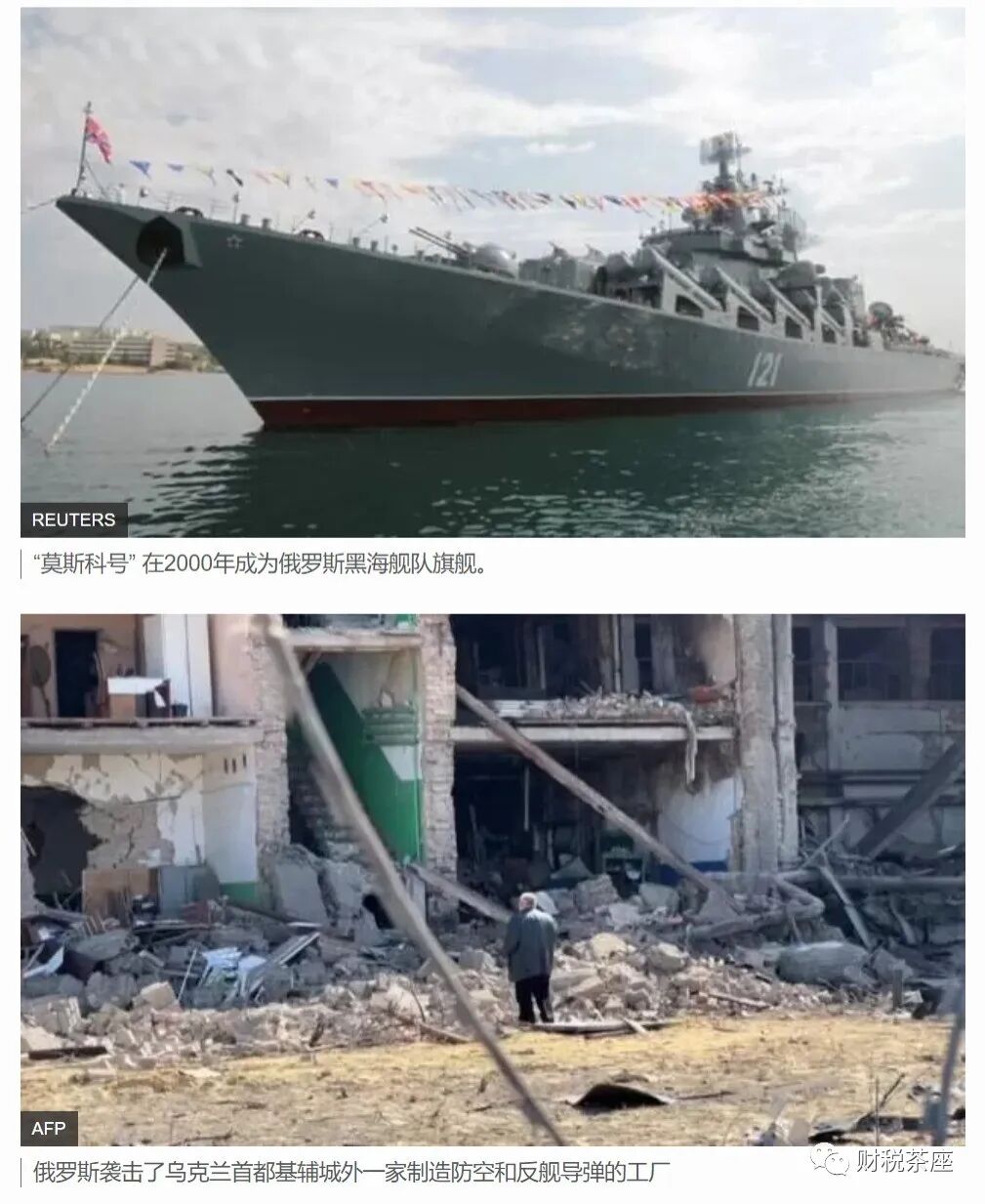 俄罗斯黑海舰队旗舰"莫斯科号" (Moskva)沉没。俄罗斯国防部表示,这艘战舰周三发生爆炸受损,被拖到港口时遭遇暴风雨而终至沉没。这艘导弹巡洋舰是俄罗斯军事力量的象征,领导了对乌克兰的海上攻击,有船员510人。