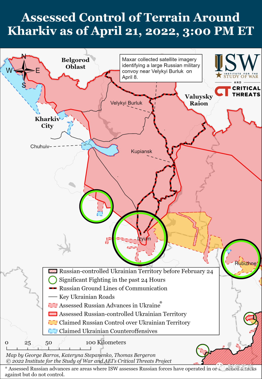 俄军部队继续在乌克兰 东部的进攻行动,但在4月21日只取得了微不足道的战果。俄罗斯声称已经俘获了全部 #Rubizhne ,这可能是错误的。#Kharkiv 和 #Izyum 更新:俄军部队继续攻击Izyum周围的 乌克兰阵地,但在过去24小时内没有获得任何领土收益。俄罗斯军队仍然基本上是公路上的,不太可能取得任何重大突破。