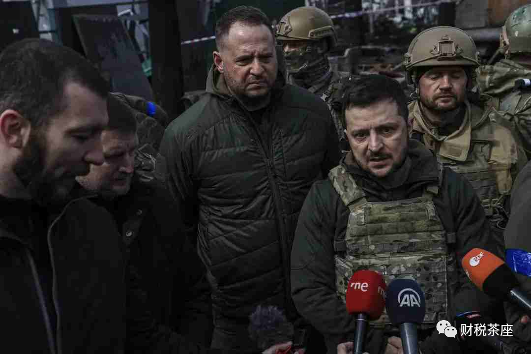 泽连斯基和他的幕僚长安德烈·耶尔马克 于 4 月 4 日在布查与记者交谈
