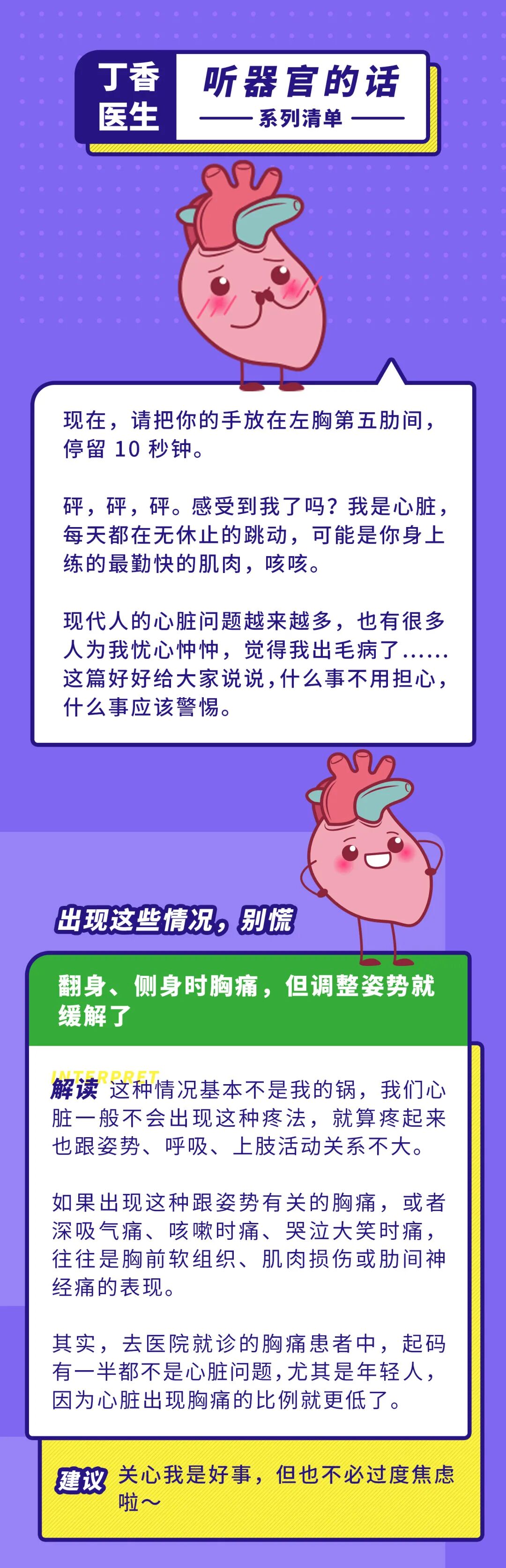 ➊ 出现跟姿势有关的胸痛,比如翻身、呼吸、咳嗽时痛,往往是胸前软组织、肌肉损伤或肋间神经痛的表现,心脏一般不会出现这种疼法。
