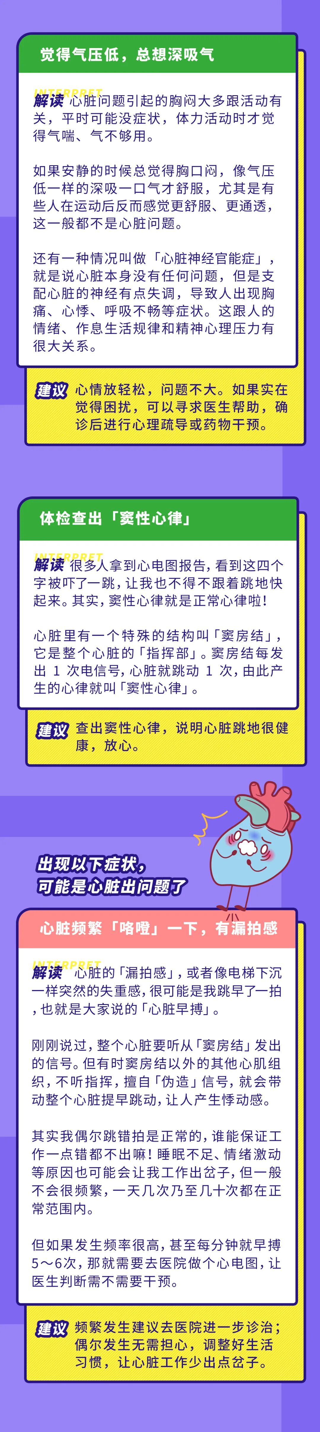 ➍ 心脏的漏拍感,或者像电梯下沉一样突然的失重感,是「心脏早搏」的表现。偶尔发生不用太担心,频繁发生建议到医院诊治。