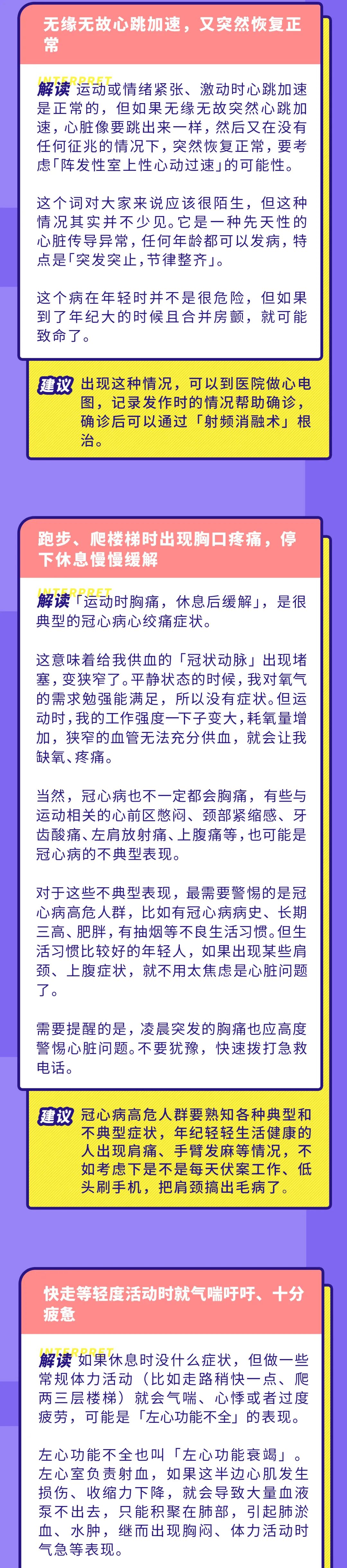 ➏ 「运动时胸痛,休息后缓解」,是很典型的冠心病心绞痛症状。有些与运动相关的心前区憋闷、颈部紧缩感、牙齿酸痛、左肩放射痛、上腹痛等,也可能是冠心病的不典型表现。