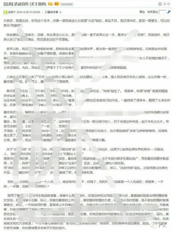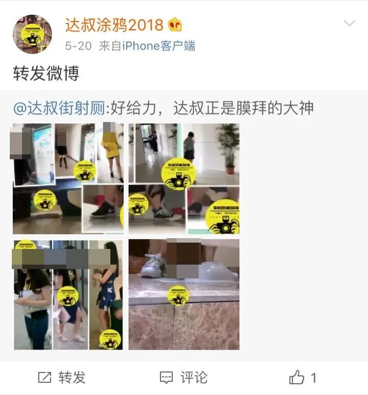 微博上有一个人叫“涂鸦达叔”,此人在自己的微博上各种晒“扫街图”,偷拍女性的隐私部位,拥有不少信徒,最爱在公交、地铁上寻找目标。