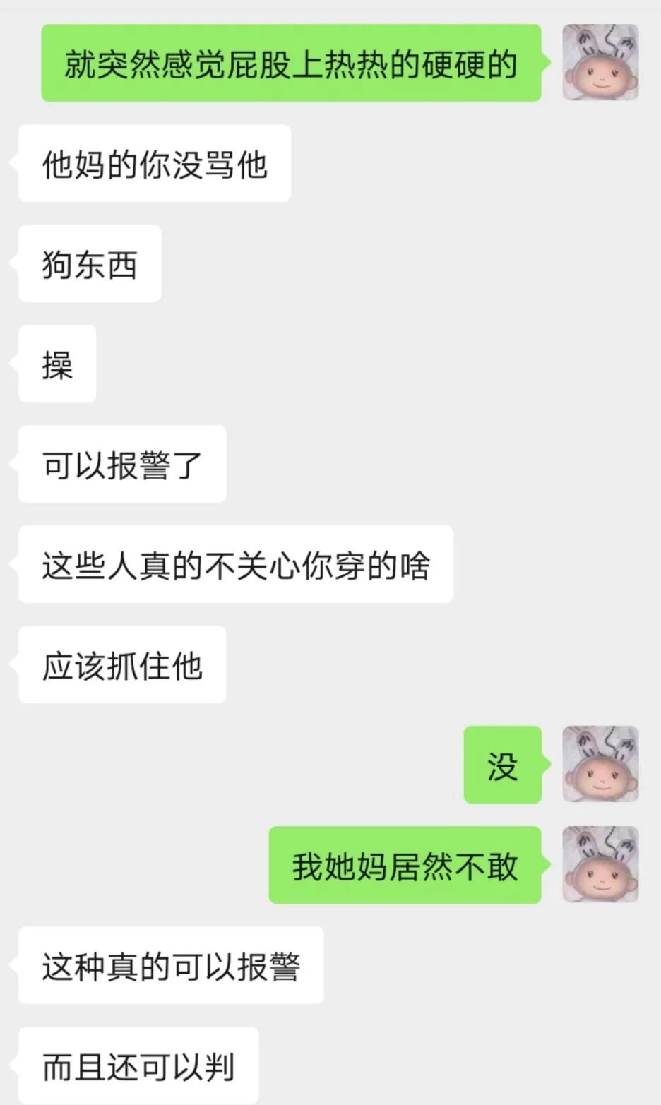 她的第一反应是挪了挪位置,但没想到那个变态干脆贴过来开始顶她大腿。那位猥亵者是个皮肤黝黑,脸上布满褶皱,手上还有纹身的中年男人。