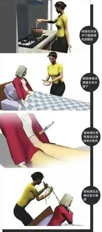 于是,很多保姆为了赚快钱,在短时间内将老人杀死,并按行规仅工作几天,就可以收取一个月的工钱,再迅速换下一个目标。