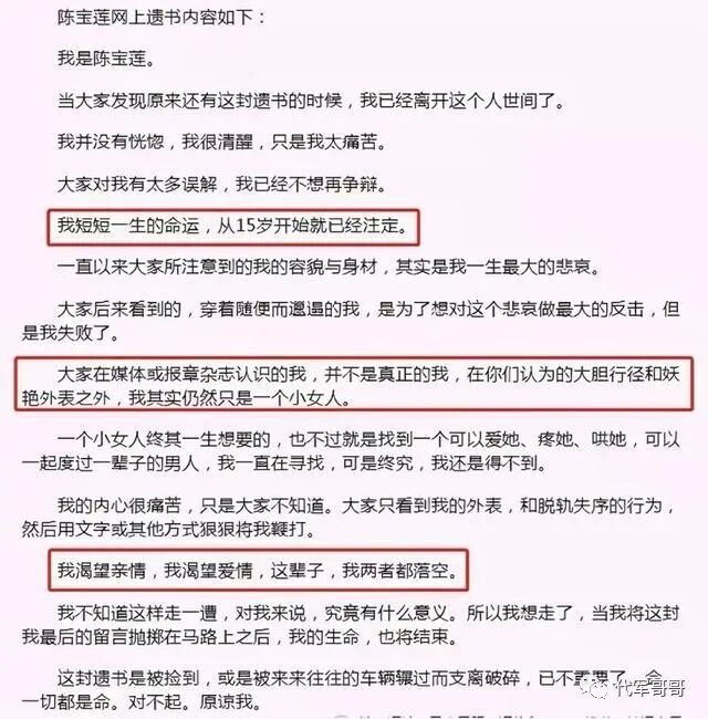 临终前,陈宝莲留下了一封遗书,她写道:“我的命运在年少时已注定,在外人看来,