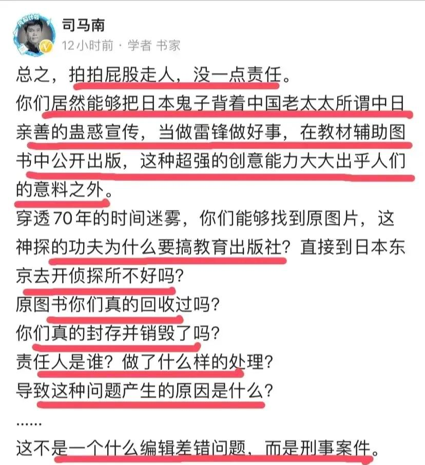对于陕西人民教育出版社的一纸声明,就连著名媒体人司马南也看不下去了,直指陕人社“拍拍屁股走人,没一点责任心”,“问题不能就这么轻描淡写的地了了!”他甚至认为,这事压根儿“不是什么编辑差错问题,而是刑事案件!”