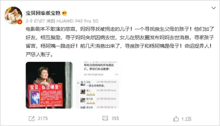 全国人大代表、宝贝回家创始人张宝艳在微博上感叹,“这是电影剧本不敢演的悲哀,命运捉弄人。”