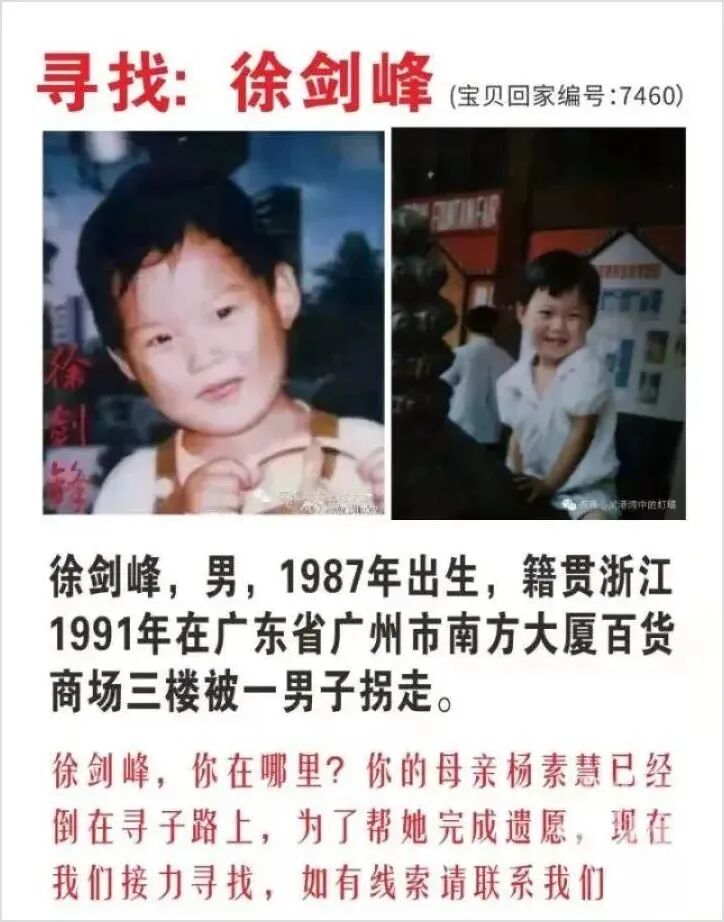 关于孩子的失踪,李芳告诉橙柿互动,“杨姐是这么讲的,1991年6月5日,她永远也忘不了这一天:丈夫带着儿子徐剑锋逛街,吸了一个陌生人递来的一根香烟,然后昏睡过去,醒来后,再也找不到4岁的孩子了。
