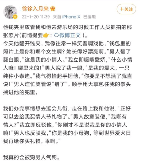 和一些网络博主一样,这个网名为“徐徐入月来”的女生喜欢在微博上用文字记录自己与男友“甜蜜”、“恩爱”的日常,与网友一起分享。