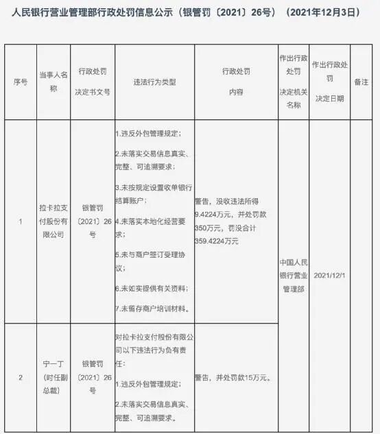 12月3日,中国人民银行营业管理部发布一则行政处罚信息公示显示,拉卡拉支付股份有限公司因7项违法行为被警告,遭罚没合计近360万元,拉卡拉时任副总裁宁一丁被处罚款15万元。
