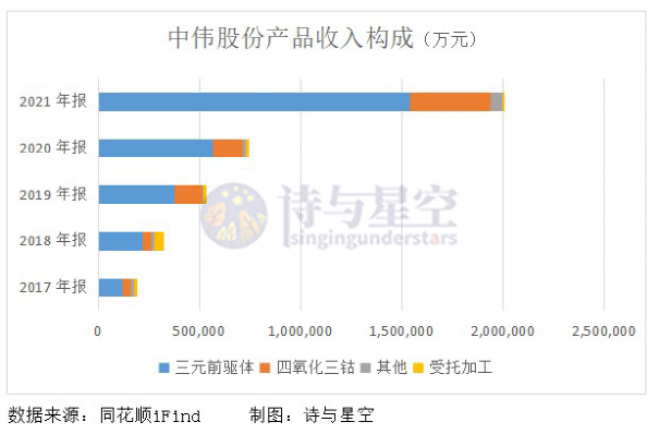 中伟股份的产品主要是三元前驱体和四氧化三钴,作为原材料供应给电池生产厂商,最终制造成三元锂电池和钴酸锂电池,应用于新能源汽车、储能和消费电子领域。