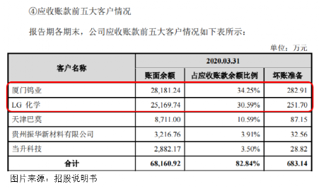 中伟股份的客户多为锂电池正极材料行业龙头企业,下游行业集中度较高。2021年前5大客户销售收入占比73.85%,虽然财报中未详细披露客户名称,但从招股书中可以推断出,主要客户是LG化学和厦门钨业。