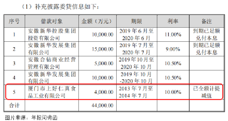 贷款客户中多次出现安徽新华发展集团,2021年又一次贷款1.5亿,年利率10%,期限为12个月。