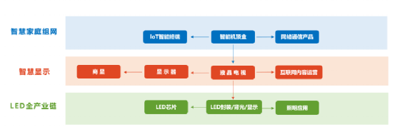 业务涵盖智慧显示、智慧家庭组网以及LED全产业链三大板块,产品主要包括液晶电视、机顶盒、LED芯片、LED封装、照明应用等。