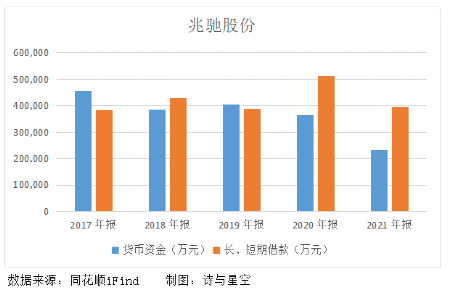近5年,兆驰股份疑似存贷双高。截止2021年年底,长、短期借款余额接近40亿,资产负债率达到55%。