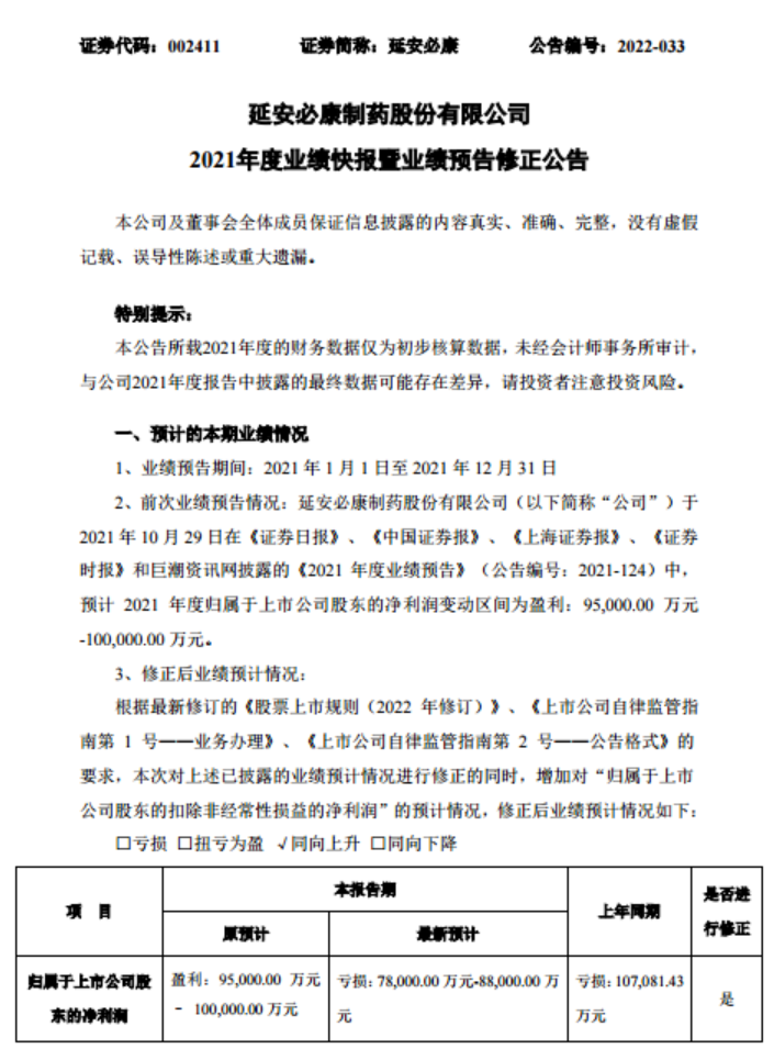 同日,延安必康发布业绩快报暨业绩预告修正公告,2021年归母净利润出现大幅修正。业绩预告修正主要是受疫情影响,在审计过程中的函证问询工作无法正常开展。公司基于谨慎性原则,对应收账款根据预计可回收金额单项计提坏账准备,并对各资产组计提减值。