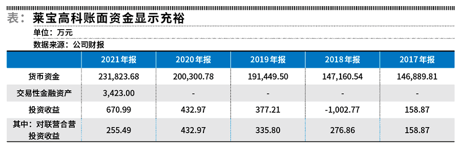 莱宝高科上市15年以来,除了极个别年份外,几乎没有长短期借款。2021年年报显示,公司账面资金高达23亿元。