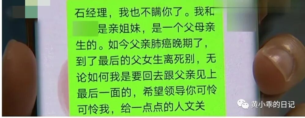 因为她的父亲时日不多,她想尽快回家陪陪父亲,可她的这一请求也被石经理拒绝了。