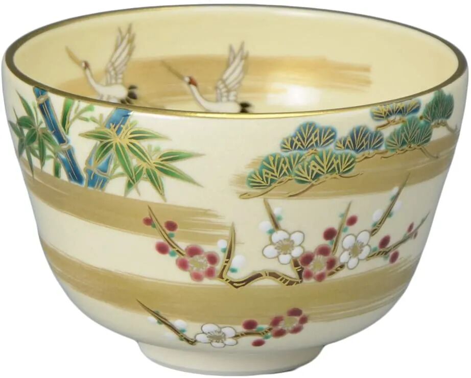 京烧 清水烧 如山窑 抹茶碗 (带绳木盒) 仁清鹤松竹梅