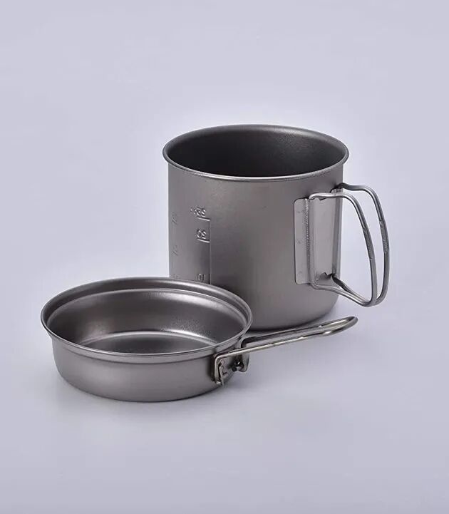 3个不同尺寸:450ml、300ml、200ml,把手可以折叠,可以套在一起收纳。单层杯可以直接上火烤,钛金属热传导率低,热量传递有缓冲,降低把手烫手或是喝水时烫到嘴巴的风险。